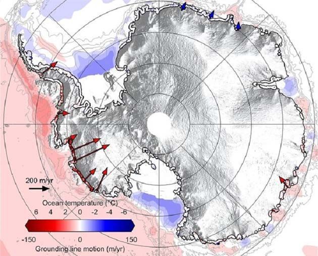 Los glaciares de la Antártida han estado retrocediendo a una velocidad promedio de 25 metros por año. Pero el retroceso de la velocidad de las líneas de tierra de 8 de los 65 glaciares más grandes de la capa de hielo es 5 veces mayor, aproximadamente 125 metros por año. Las tasas más dramáticas de retirada de la línea de tierra se midieron a lo largo de la costa de la Antártida Occidental.