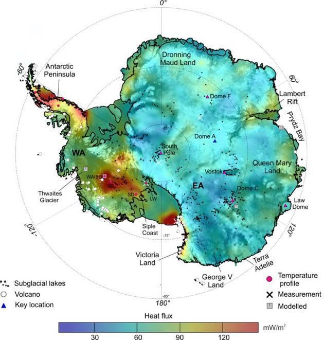 Unos días después de este descubrimiento el British Antarctic Survey (BAS), reveló un nuevo mapa de calor antártico. El mapa muestra hotspots submarinos en el continente helado. Representa el «flujo de calor geotérmico» en la base de la capa de hielo de la Antártida.