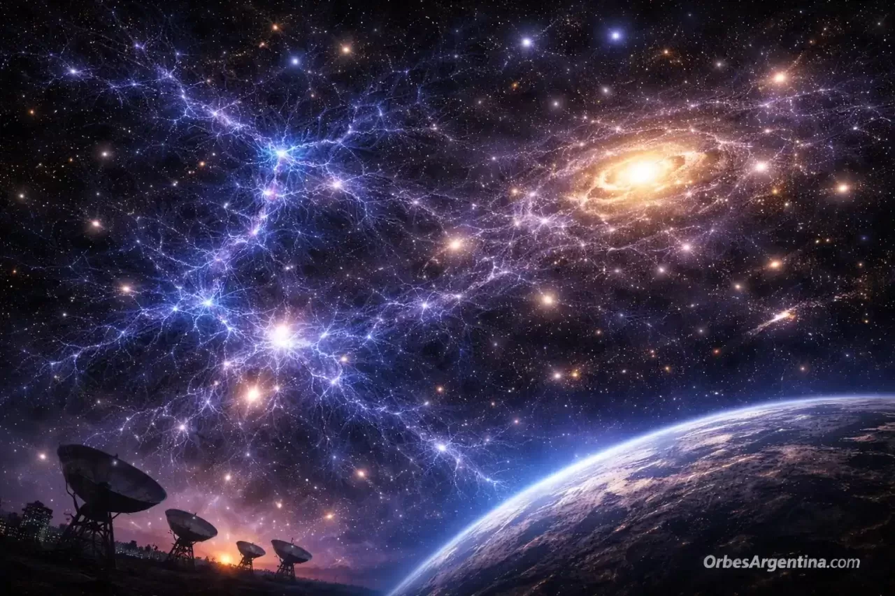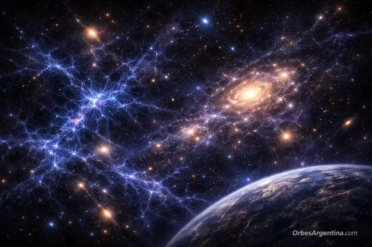 En estudios del Observatorio Europeo Austral sobre estructuras cósmicas, se analiza cómo la materia oscura forma una red invisible que conecta galaxias, conocida como la “telaraña cósmica”.
