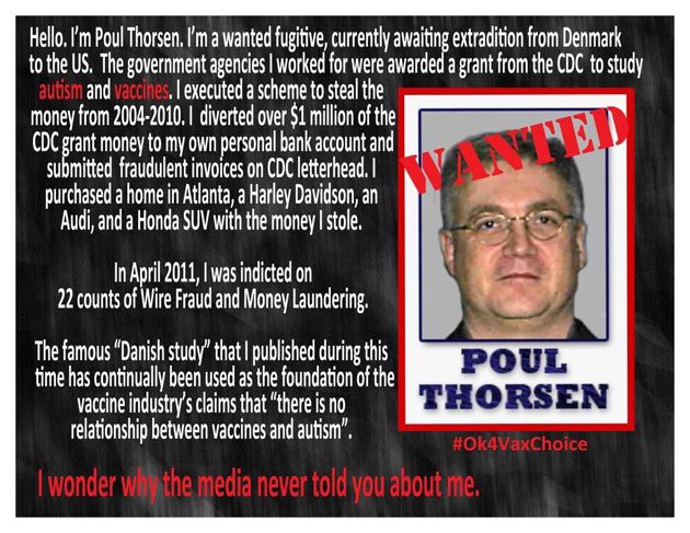 Poul Thorsen robó más de un millón de dólares de la subvención de los CDC. Se suponía que esta subvención iba a ser utilizada para la investigación sobre el autismo. World Mercury Project explica: El producto del trabajo de Poul Thorsen para los CDC fue una serie de artículos fraudulentos sobre las tasas de autismo danés.